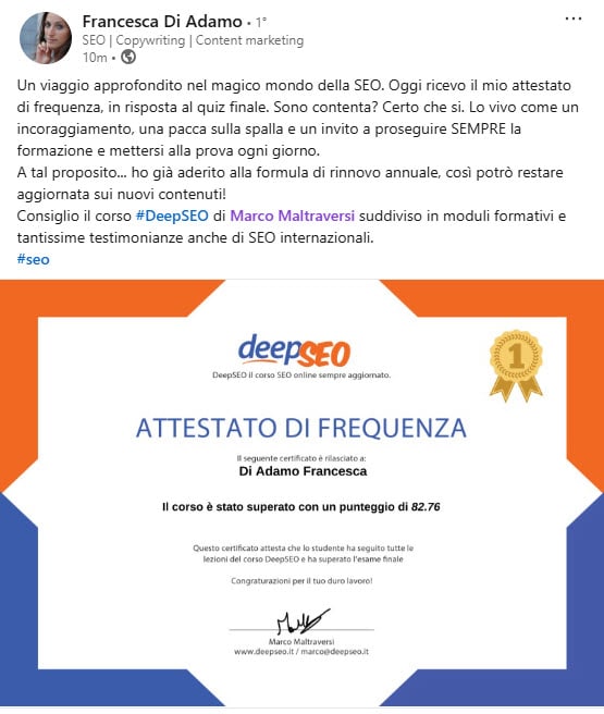 Potrai provare in modo pratico quanto appreso, lavora in team su un sito reale, ottimizzalo, sperimenta, sbaglia e riprova. Inoltre il nostro corso è CERTIFICATO: dopo il superamento di un esame potrai ottenere la certificazione delle competenze (Per chi ha acquistato il piano advanced) ! Scopri di più