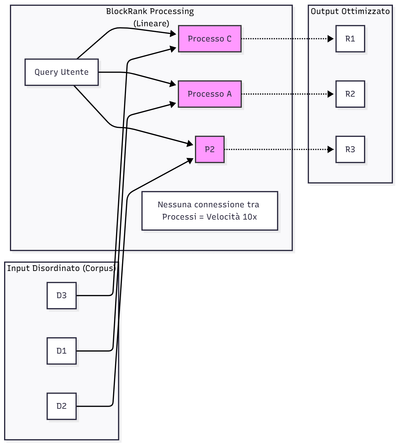 Esempio Concreto: Processare 500 documenti (~100.000 token) richiede a BlockRank meno di 1 secondo, un tempo impensabile per un modello standard di pari dimensioni senza ottimizzazioni hardware estreme.1