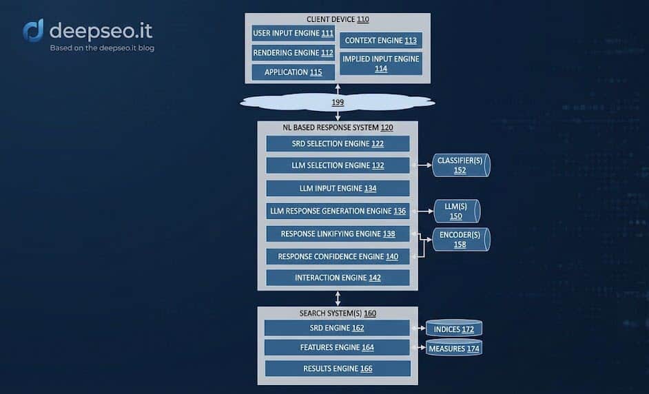Per confermare che questa non è solo teoria accademica, ho analizzato il brevetto “Generative summaries for search results” (Assegnatario: Google LLC). Questo documento è la blueprint di come funziona AI Overviews. Ecco due diagrammi fondamentali estratti dal brevetto che spiegano il processo.