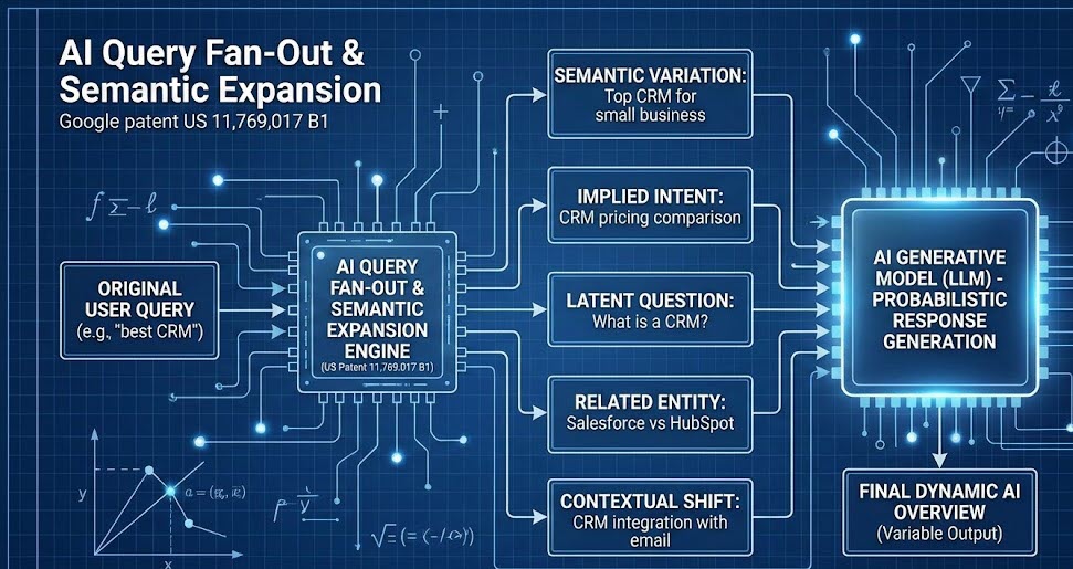 Un altro concetto chiave nel brevetto è l’espansione della richiesta. L’AI non risponde solo alla query esatta dell’utente. Esegue un Fan-Out (ventaglio) di query correlate per coprire l’argomento.Se il vostro contenuto è ottimizzato solo per la keyword esatta (vecchia SEO), rischiate di essere esclusi quando il modello decide di esplorare una variante semantica laterale durante la generazione.